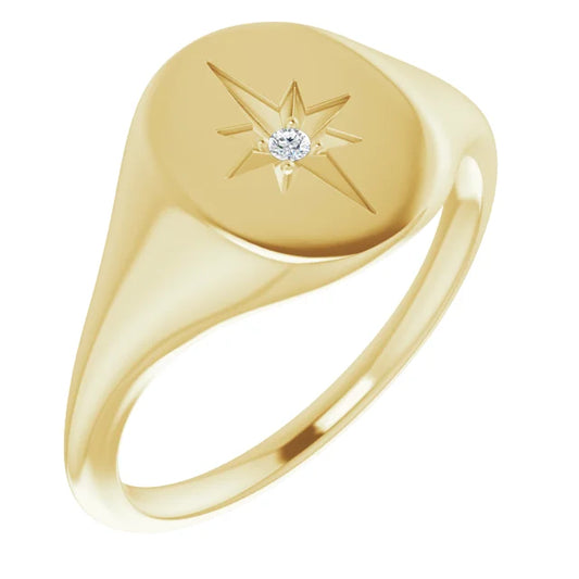 14K Gold Oval Natural Diamond Starburst Signet Ring
