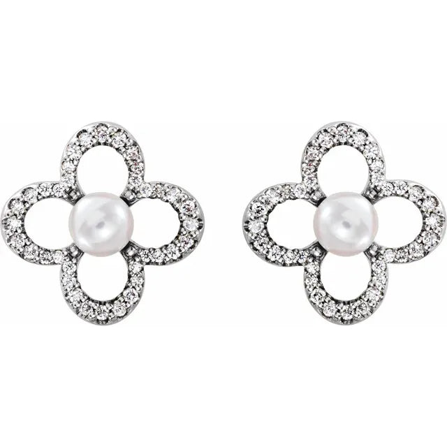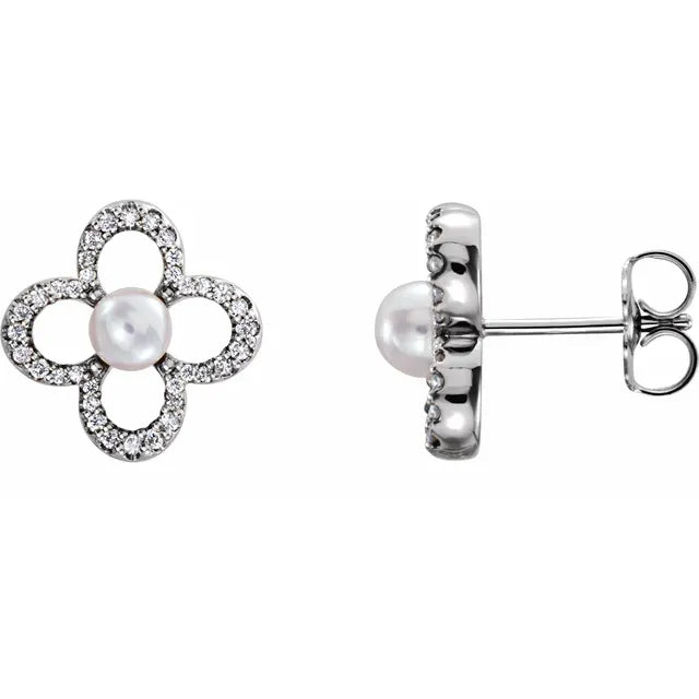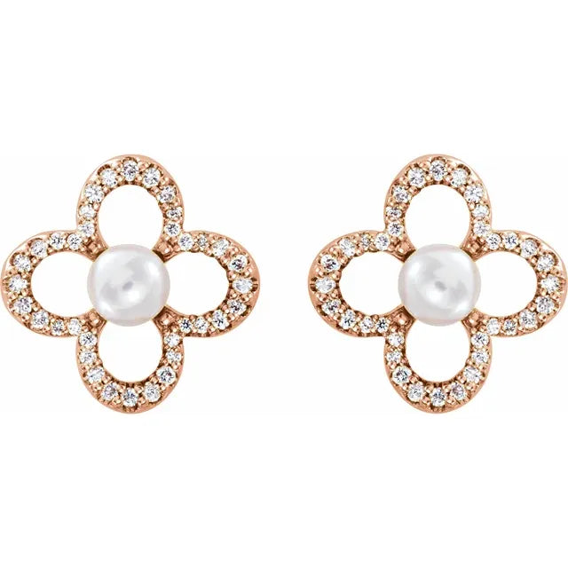 14K Gold Diamond Clover Earrings with Cultured Freshwater Pearl